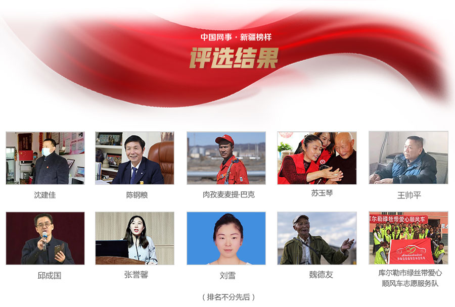 “中国网事·新疆榜样”2020年度十大网络感动人物,有用毕生精力圆学子梦沈建佳,“骆驼爷爷”陈钢粮,新时代石油工人好榜样肉孜麦麦提·巴克,从死神手中逃脱的天使苏玉琴,身残志坚默默奉献王帅平,把“教育孤岛”连成“大绿洲”邱成国,用新媒颂青春张誉馨,在方舱里当“生活小保姆”刘雪,守护在边境上的“老羊倌”魏德友,集小善成大爱库尔勒市绿丝带爱心顺风车志愿服务队。