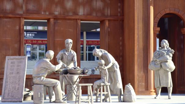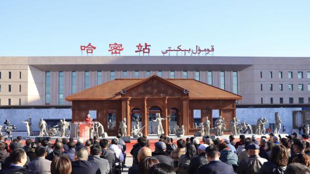10月18日,“哈密精神”情景式公共艺术作品在新疆维吾尔自治区哈密市哈密火车站站前广场正式落成。