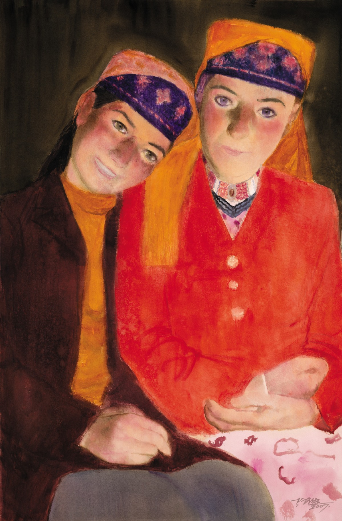 陈坚的作品之所以动人,还在于其背后深厚的情感温度,他笔下的塔吉克人不是被“观看”的对象,而是与他共同生活的亲人。在《塔吉克两姐妹》中,两位少女的眼神清澈而坚定,仿佛能听见她们的低语、感受到心跳的节奏。画家不是在“画模特”,而是在“画人物”,画面中投射出人物的情感与内心,成为艺术家对生命尊重与理解的体现。