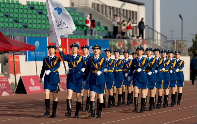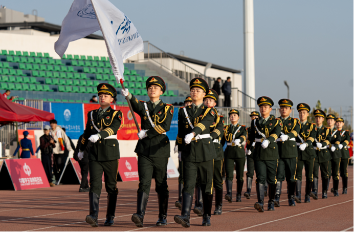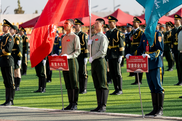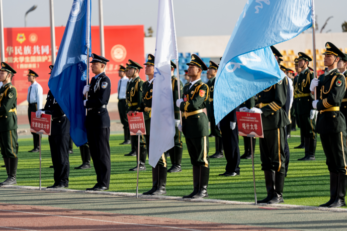 赛事分为公开组(非西部赛区省份院校)、甲组(普通组)和乙组(高职高专组)3个赛道,各设男子组、女子组和混编组3个组别。在未来3天的比赛时间里,参赛队伍将通过升旗展示和队列动作2个项目一较高下,评委将从动作规范、精神风貌、团队协作等多个维度进行现场评分。 开幕式上,伴随着激昂的旋律,各高校参赛队伍迈着矫健整齐的步伐依次入场,队员们精神抖擞、英姿飒爽,口号声铿锵有力,展现出了当代大学生的青春风采和昂扬斗志。来自不同省份的参赛师生共同参与升国旗活动,在庄严的国歌声中,全体师生面向国旗行注目礼。