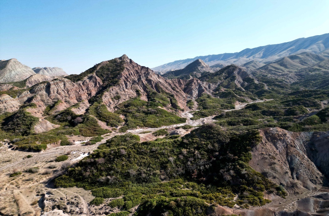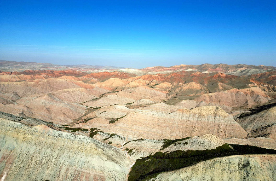 昌吉百里丹霞风景道,山峦间点缀着成片的绿色灌木,为壮阔的丹霞增添了几分生机。(刘华摄)