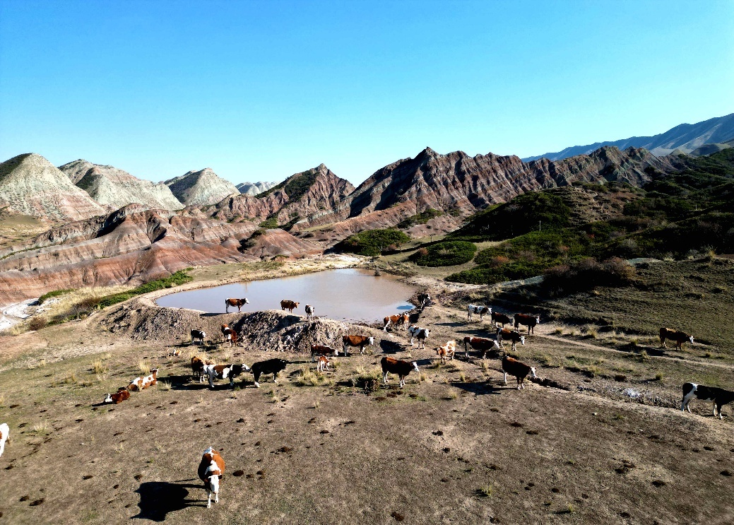 昌吉百里丹霞风景道,水塘边的牛群正悠闲踱步,有的低头啃食着岸边的枯草,有的缓缓走进水中饮水,恰似一幅鲜活的田园山水图。(刘华摄)