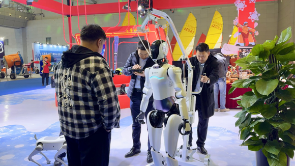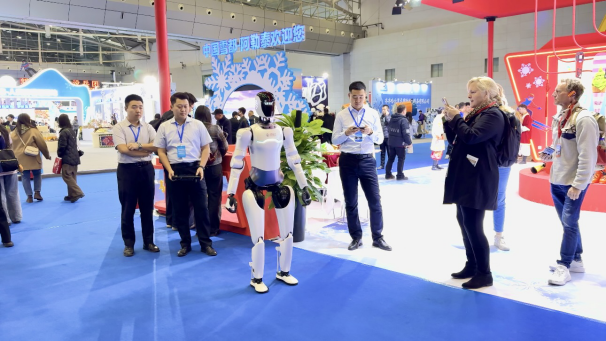 第十九届新疆冬季旅游产业交易博览会乌鲁木齐展区内,嘉宾与机器人展开互动,感受科技与文旅融合的独特魅力。臧嵘摄