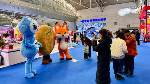 第十九届新疆冬季旅游产业交易博览会现场,观众及嘉宾与展区玩偶热情互动,合影记录展会精彩瞬间。臧嵘摄