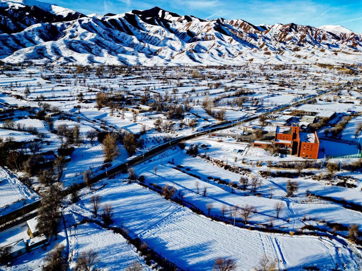 11月27日,冬日的吉木萨尔县新地乡与远处雪山交相辉映。