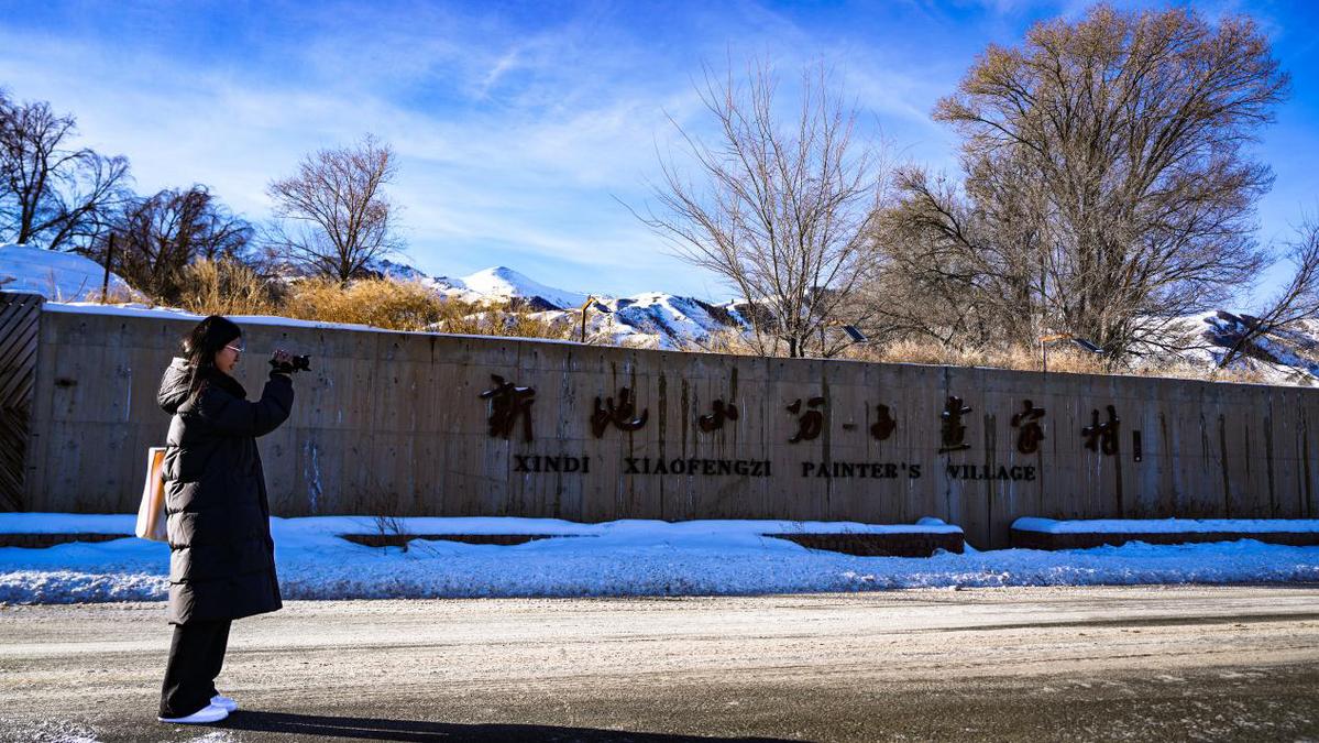 11月27日,一名游客正在新地乡小分子“画家村”打卡拍照。