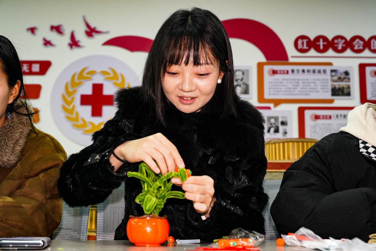 11月27日,在吉木萨尔县新地乡陶艺文创馆,游客正在制作手工艺品。