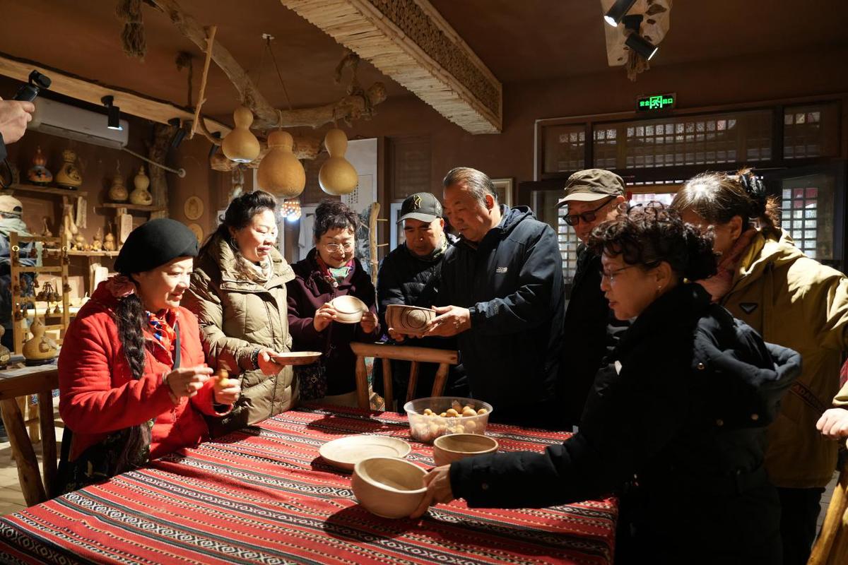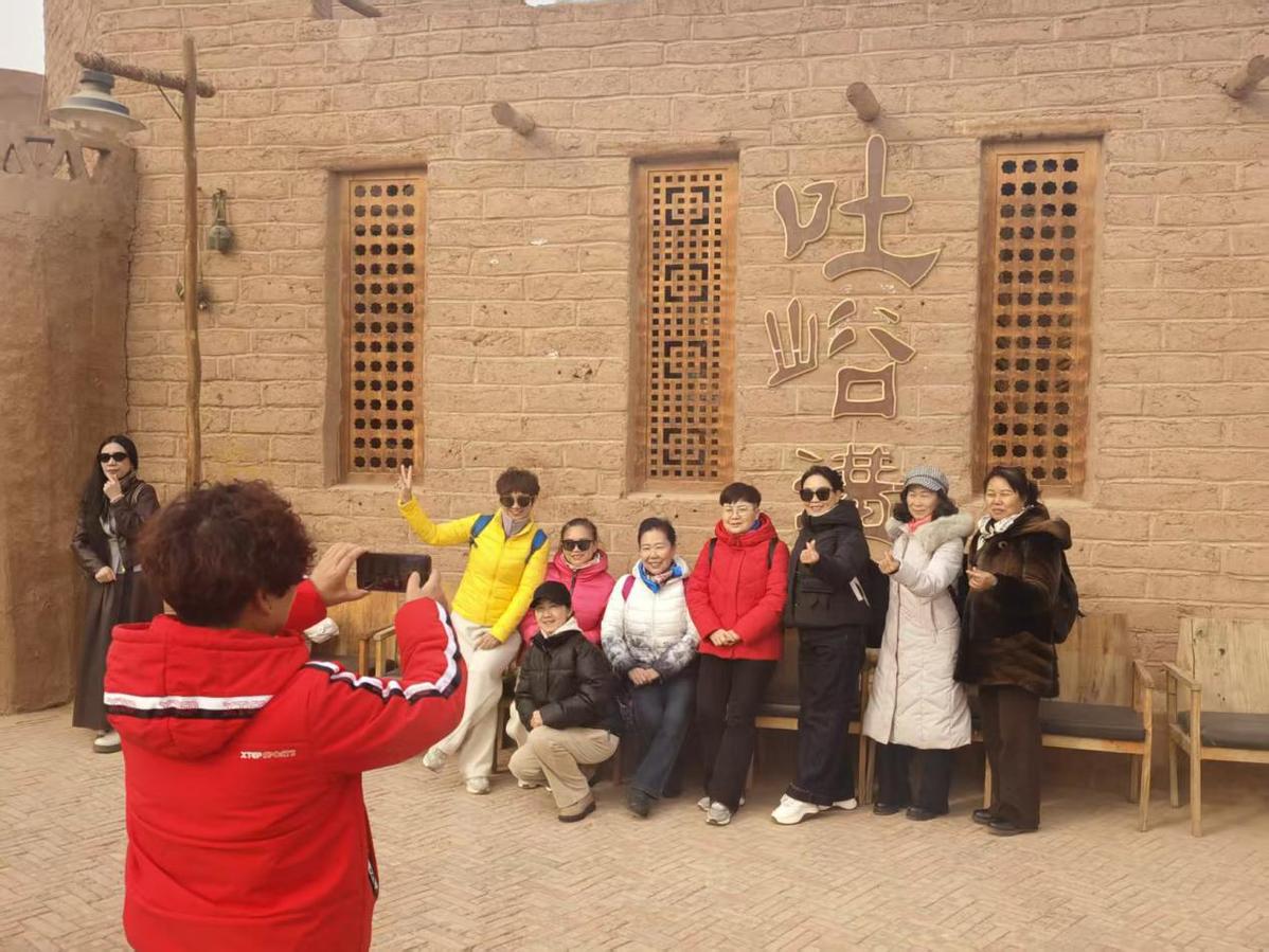 循着古村肌理,游客们探寻千年文明密码。冬日阳光洒在特色生土建筑上,古老殿宇、网红坡更显古朴厚重;登顶最高观景点,吐峪沟大峡谷的苍茫壮阔尽收眼底,丹霞地貌与冬日天色交相辉映,别具韵味;走进吐峪沟石窟,在斑驳古迹中追溯丝路文化交融印记,感受历史与冬日的静谧共鸣。沿途精心布置的冬季旅拍点位、文创店铺推出的冬日限定手作、古玩摊位藏着的时光故事,让每一处驻足都成为难忘的文旅体验。