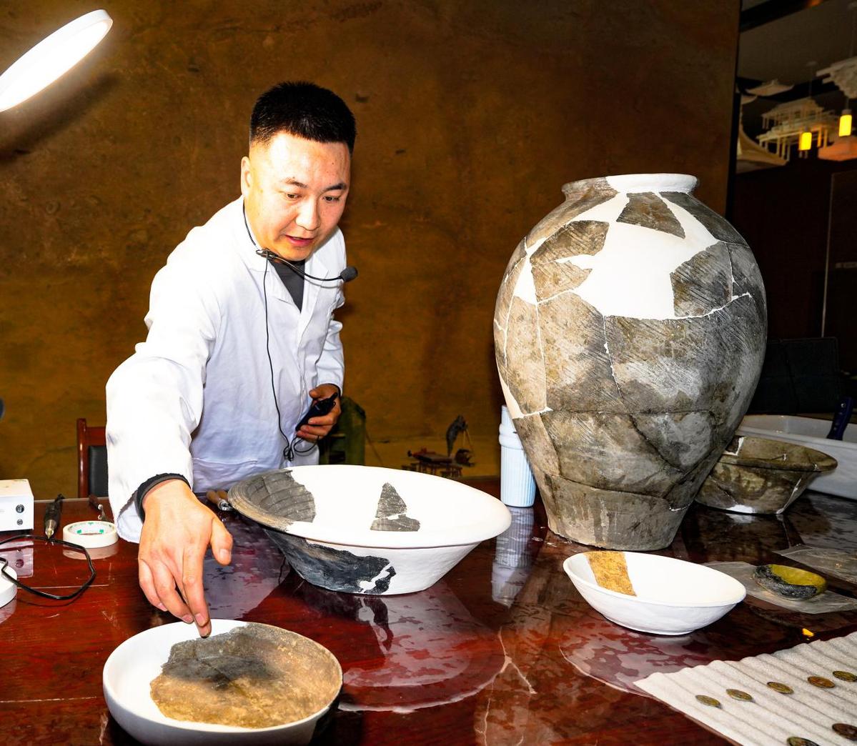11月26日,丝绸之路北庭故城遗址博物馆文物修复区,北庭学研究院文物修复师展示修复过程。 常谊谊 摄