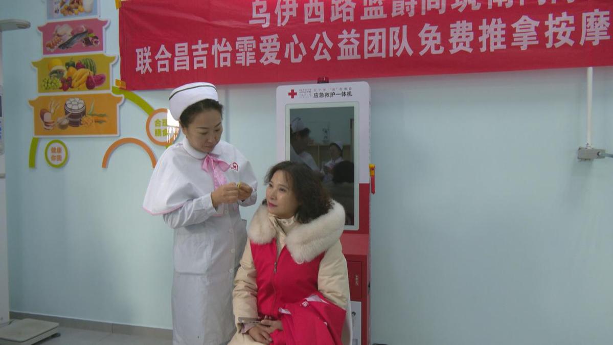 (在活动现场,志愿者们正在进行爱心义诊,贴耳穴。袁琪浩 摄)