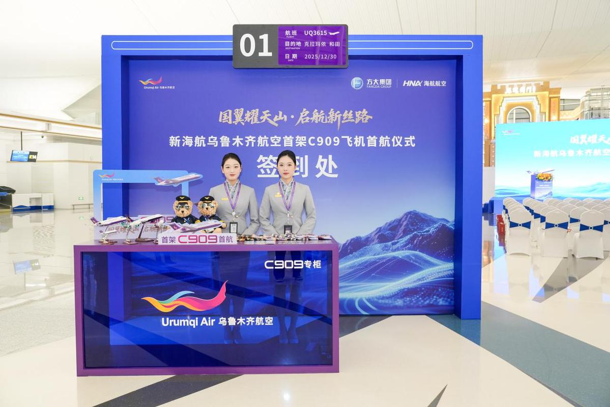 首航航班执飞“乌鲁木齐=克拉玛依=和田”航线,为提升首航旅客体验,乌鲁木齐航空特别设置了C909飞机专属值机柜台,并为首航旅客发放了具有收藏价值的定制纪念登机牌及特色礼品,让旅客从值机开始便能沉浸式感受国产民机首航的独特纪念意义。此航线的开通,有效串联了北疆的“工业明珠”克拉玛依与南疆的“文化坐标”和田,为旅客探索新疆全域提供了更便捷、舒适的空中通道。