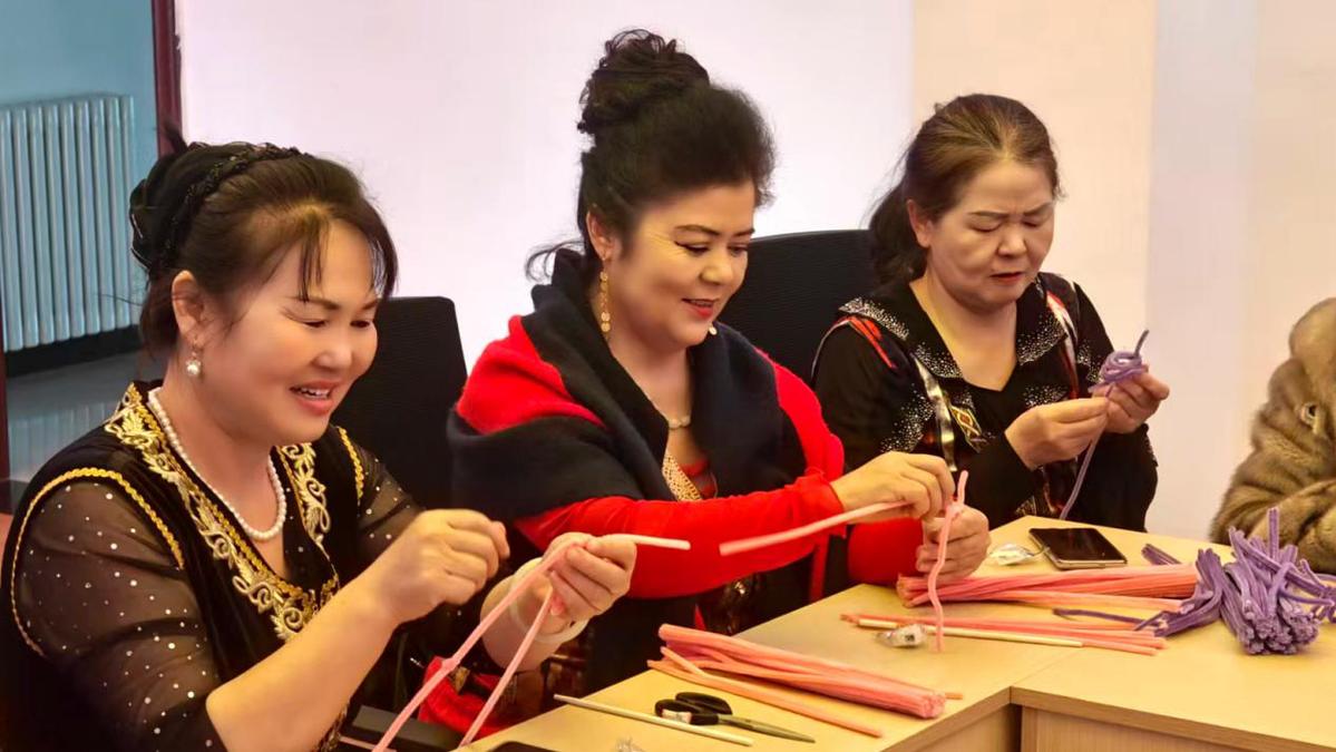 “热依汗阿姨,您看,这样绕一圈,一朵花瓣的形状就出来了。”在和田街街道水利社区,志愿者孙启招正用慢动作演示,帮助维吾尔族阿姨热依汗掌握扭扭棒技巧。五彩的扭扭棒在她手中渐渐绕出一朵粉红玫瑰。