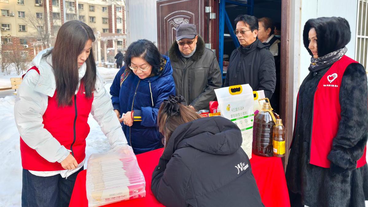 在红庙子街道西城街北社区的广场上,一幕温馨的关怀场景正在上演。社区工作人员和“银发”志愿者正将一份份特制的营养挂面,递到排队前来的退休职工手中。