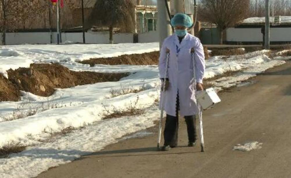 在霍尔果斯市伊车嘎善锡伯民族乡,有一位女村医,每天拄着双拐奉献在抗击新冠肺炎疫情的一线,用实际行动践行着医生的初心和使命,她就是赤哲嘎善村村医朱彩霞。