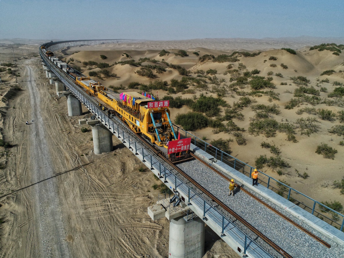 8月17日中午,在位于新疆民丰县的和若铁路施工现场,随着两根500米长轨平稳落入道床,和若铁路全线最高特大桥若克雅特大桥铺轨完成,和若铁路建设取得阶段性进展,全长825.476公里的和若铁路铺轨任务还剩55公里,全线铺通在即。