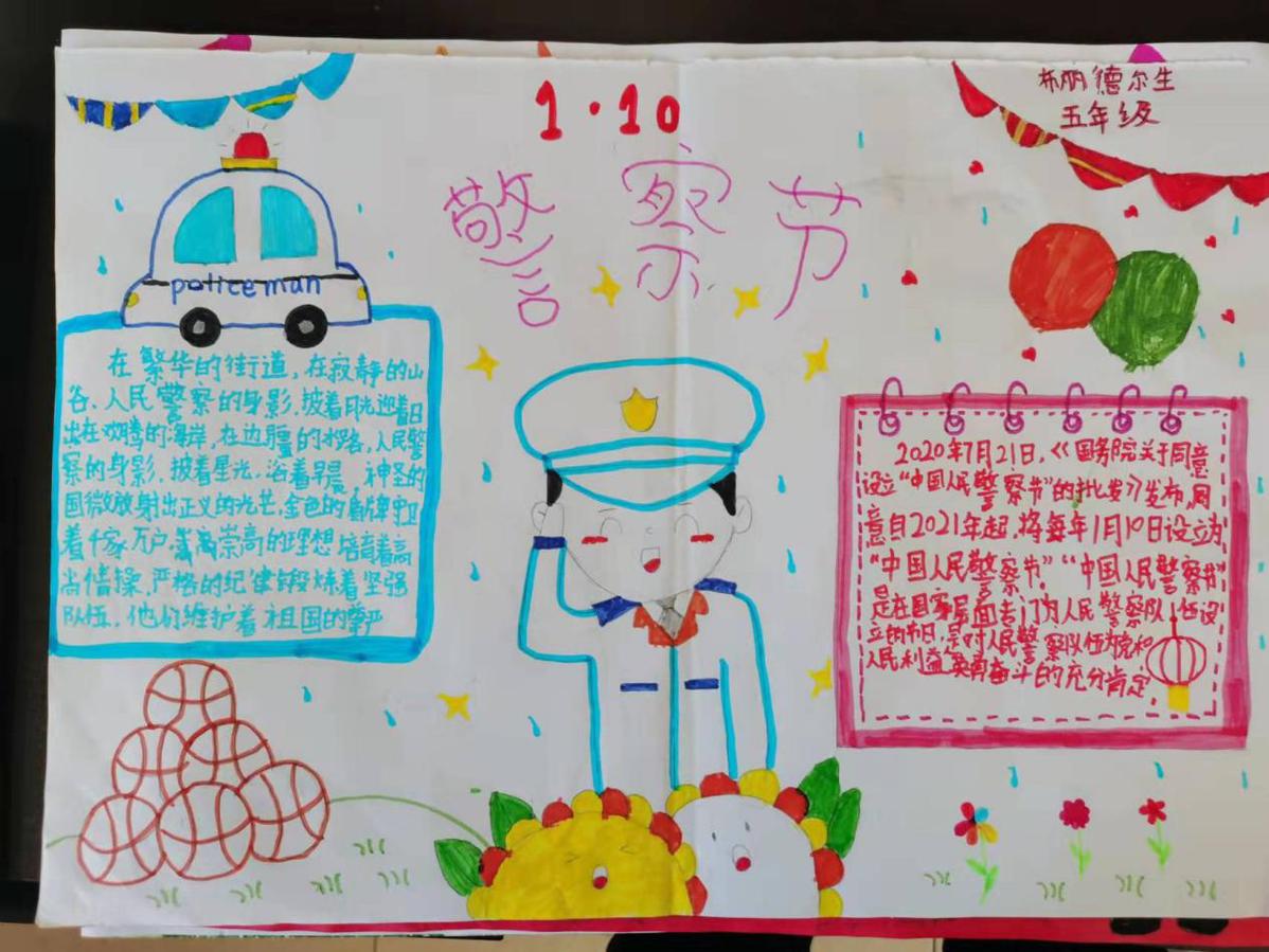 2022年1月10日是第二个中国人民警察节。为庆祝第二个“中华人民警察节”,新疆额敏县公安局额玛勒郭楞蒙古乡的小朋友们学生们通过说一句话、视频、手抄报的形式,用画笔画出他们心中最美的警察叔叔阿姨,将人民警察的英勇形象以及对人民警察的拥护之心,敬佩之心表达于纸上。