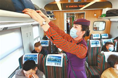 在乌鲁木齐至克拉玛依一站直达复兴号城际列车上,乘务员正在整理旅客行李。(陈继伟摄)