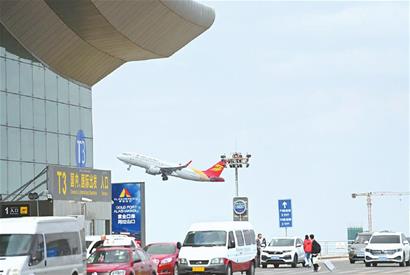 5月3日,在乌鲁木齐地窝堡国际机场T3航站楼,接送乘客的车辆有序运行。(陈岩摄)