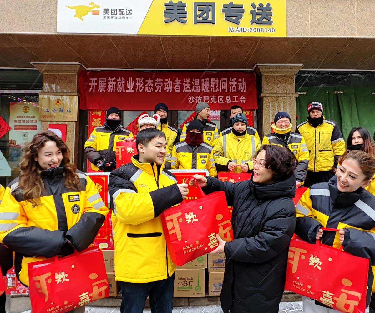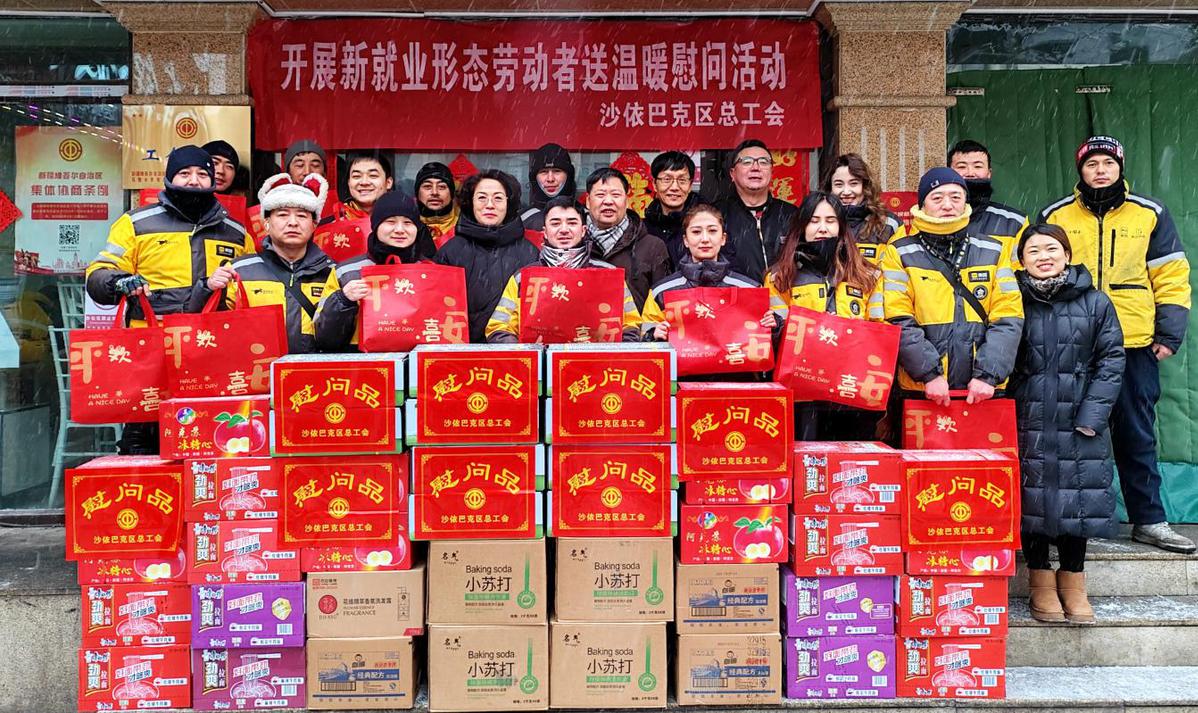1月17日,乌鲁木齐市沙依巴克区总工会工作人员带着手套棉帽、洗漱包、水果等“暖心礼包”,前往扬子江美团外卖点、于田街饿了么等站点,亲切关怀了外卖小哥等新就业形态劳动者,了解他们的工作和生活情况,向他们的辛勤付出表示感谢,叮嘱大家做好防寒保暖,安全出行。