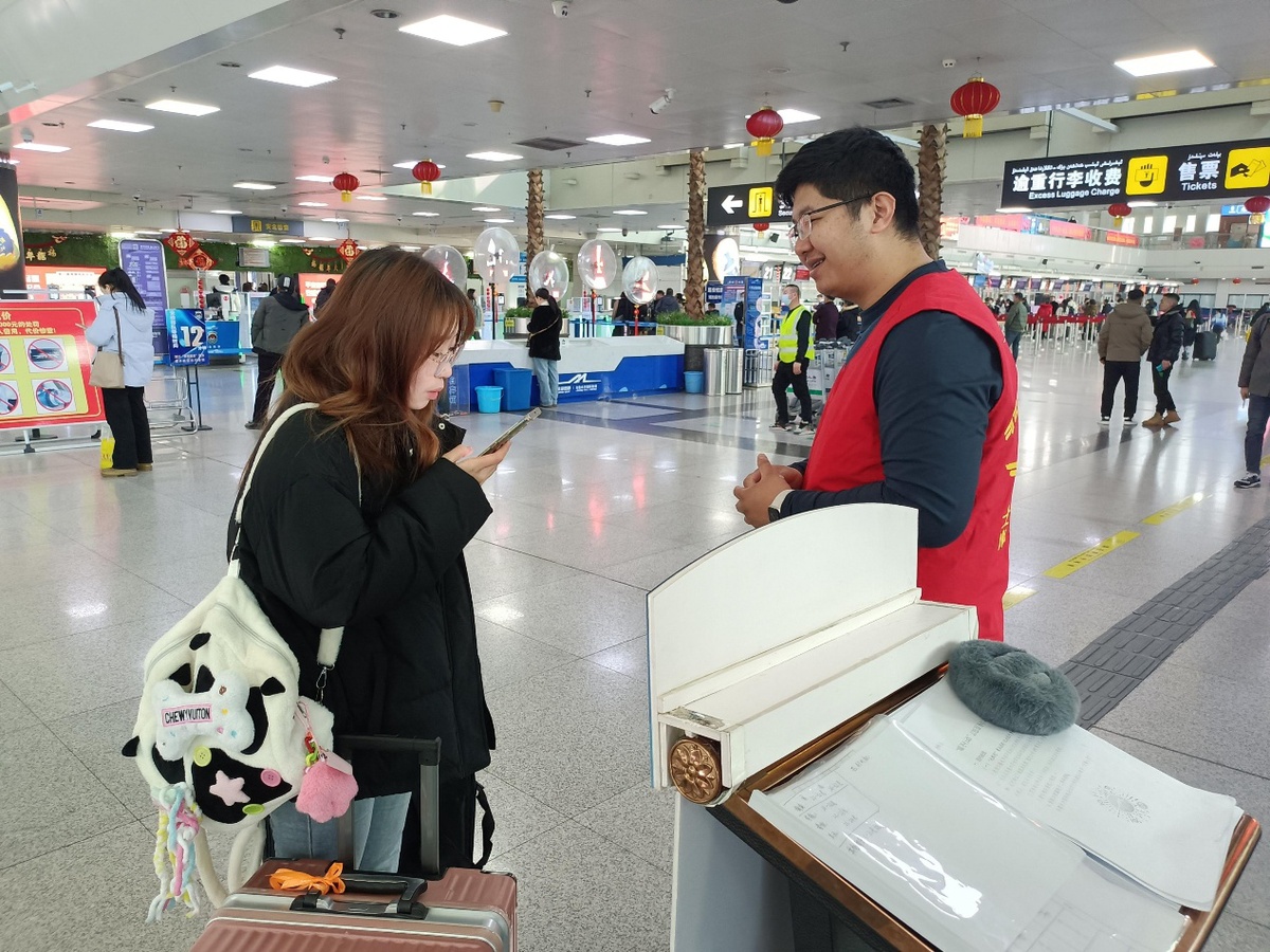 活动中,团员青年们身穿工作服,穿梭在候机楼的每个角落。在候机楼入口处,志愿者们协助登机的旅客搬运行李,引导旅客办理乘机手续及托运行李。在问询处,志愿者们为行动不便的老弱病残旅客提供轮椅服务,并协助航班不正常的旅客联系航司及售票处退改签。在安检待检区,志愿者们为旅客讲解过检流程,方便旅客快速顺利通过安全检查。在候机区,志愿者们指引旅客前往对应的登机口候机,讲解登机注意事项,保障旅客顺利出行。