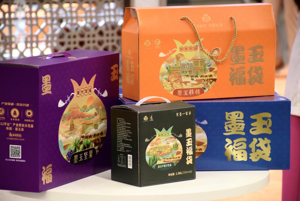 活动当天,和田区域公用品牌 “墨玉福袋”礼盒同步首发。作为和田区域品牌矩阵的重要组成部分,“墨玉福袋”紧扣“铸牢中华民族共同体意识”主题,礼盒上的“石榴”图案寓意民族团结。装有核桃、玛仁糖、芦荟汁等墨玉县特色农副产品的“福袋”,成为北京市民了解墨玉、走进墨玉的重要纽带。