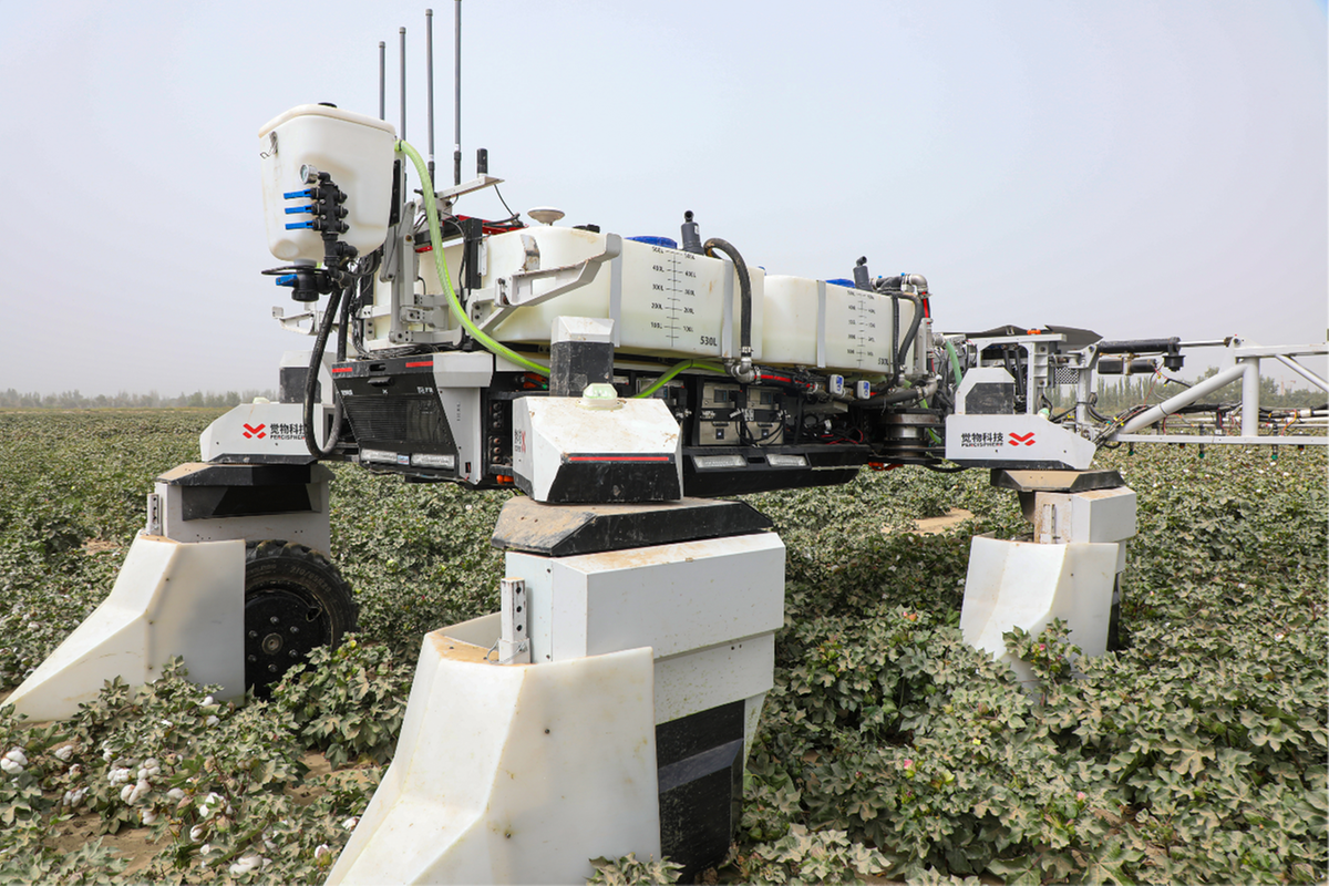 据了解,这台智能机器人名为“鹤出T3000”,机身搭载长达21米的喷杆,单趟作业可覆盖9行棉花,最高行进速度达每秒2米,综合作业效率每分钟达3亩地以上,较传统机械作业提升一倍以上。同时,该机器人的轮距和机腹离地高度可自由调整,可广泛匹配不同种植行距和株高的作物,主要应用在叶面肥喷洒、药物喷施等农事中,不仅节省人力成本,还提升了作业质量和效果。