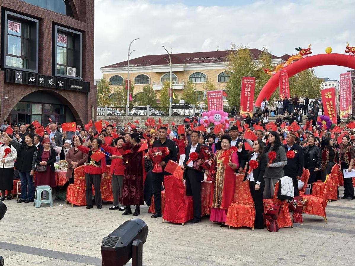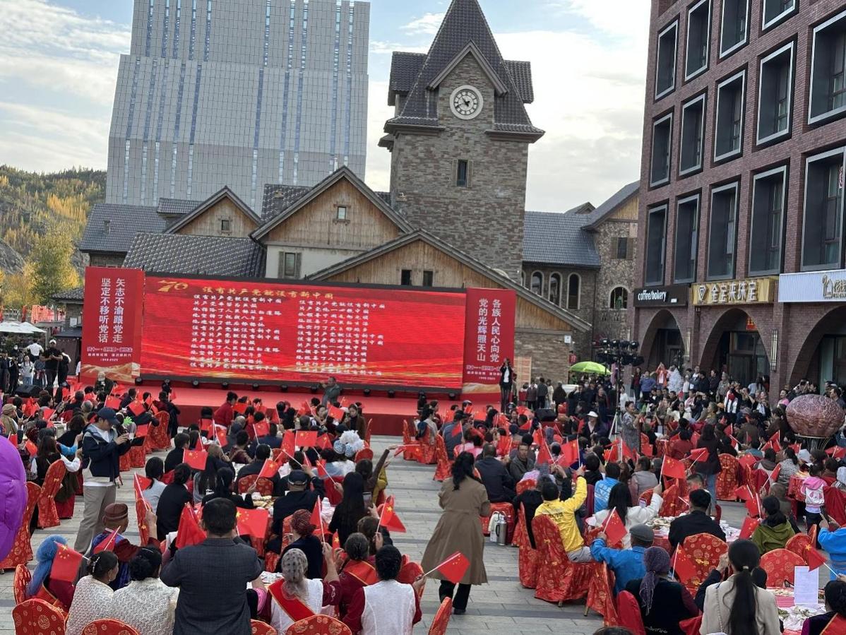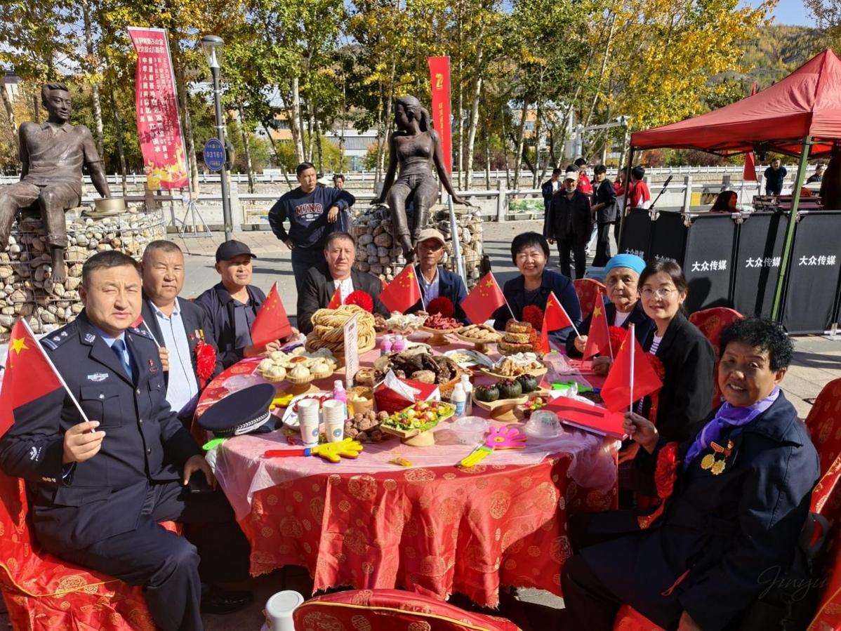 秋日的新疆阿尔泰山麓层林尽染,克兰河畔炊烟袅袅。9月29日,在中华人民共和国76周年华诞之际与新疆维吾尔自治区成立70周年的历史性时刻,阿勒泰市五百里风情街上,一场以“党旗映金山 铸牢聚民心”为主题的百家宴融情活动,将雪都的团结奋进篇章书写得格外炽热。300名来自全市各行业的模范代表、各界群众围坐30张圆桌,以美食为媒、以榜样为灯,在《没有共产党就没有新中国》的嘹亮歌声中,共同奏响“铸牢中华民族共同体意识”的时代交响曲。