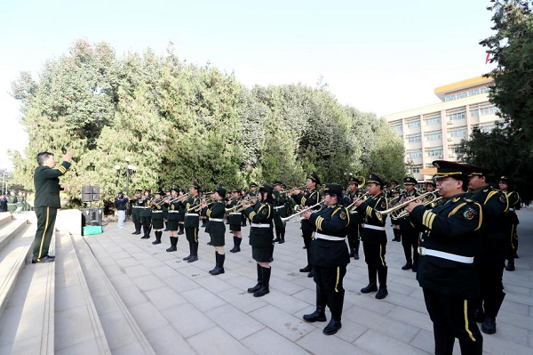 “我们是共产主义接班人,继承革命先辈的光荣传统,爱祖国爱人民……”军乐团奏响《我们是共产主义接班人》,现场师生向王震将军铜像行注目礼。