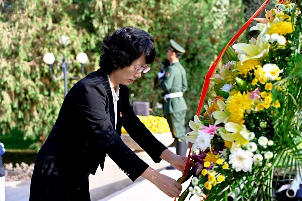 塔里木大学党委书记张爱萍缓步走上广场台阶,在王震将军铜像前驻足凝视,整理花篮缎带。
