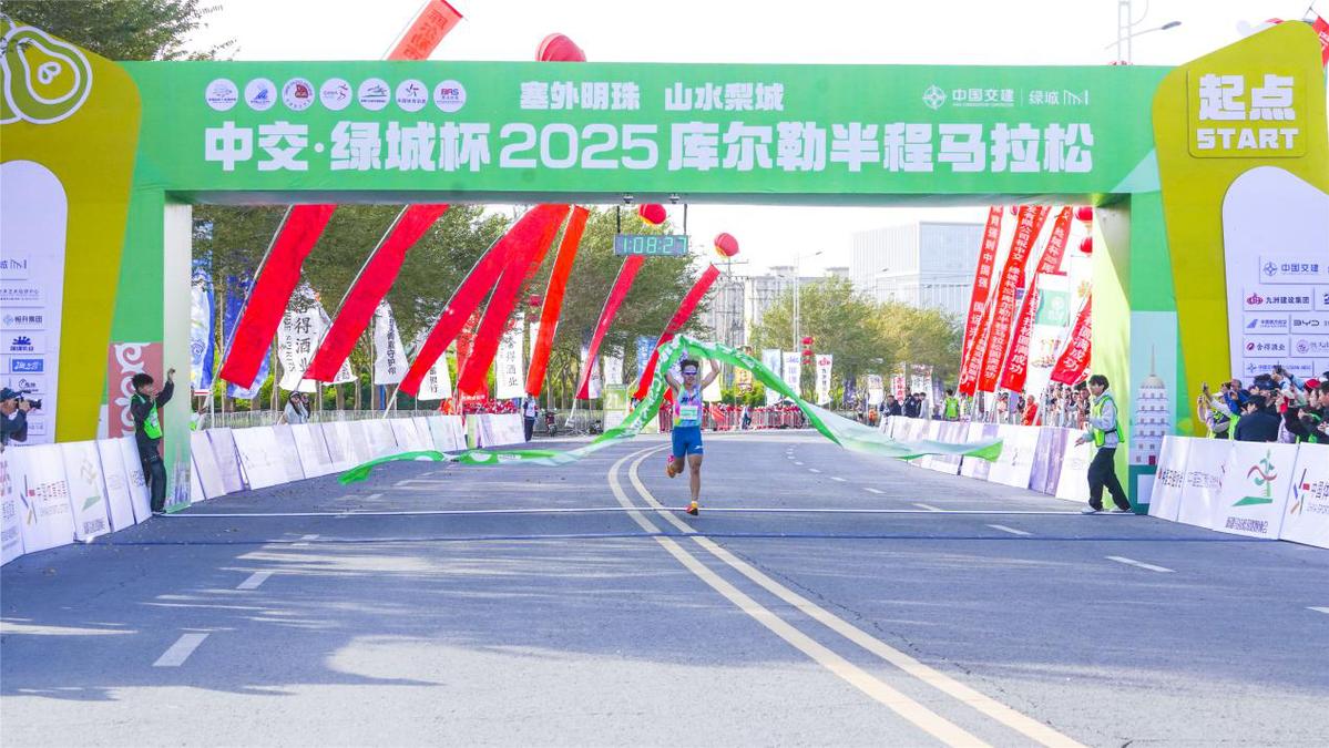 10月2日,中交·绿城杯2025库尔勒半程马拉松选手冲刺夺冠。 黄万里摄