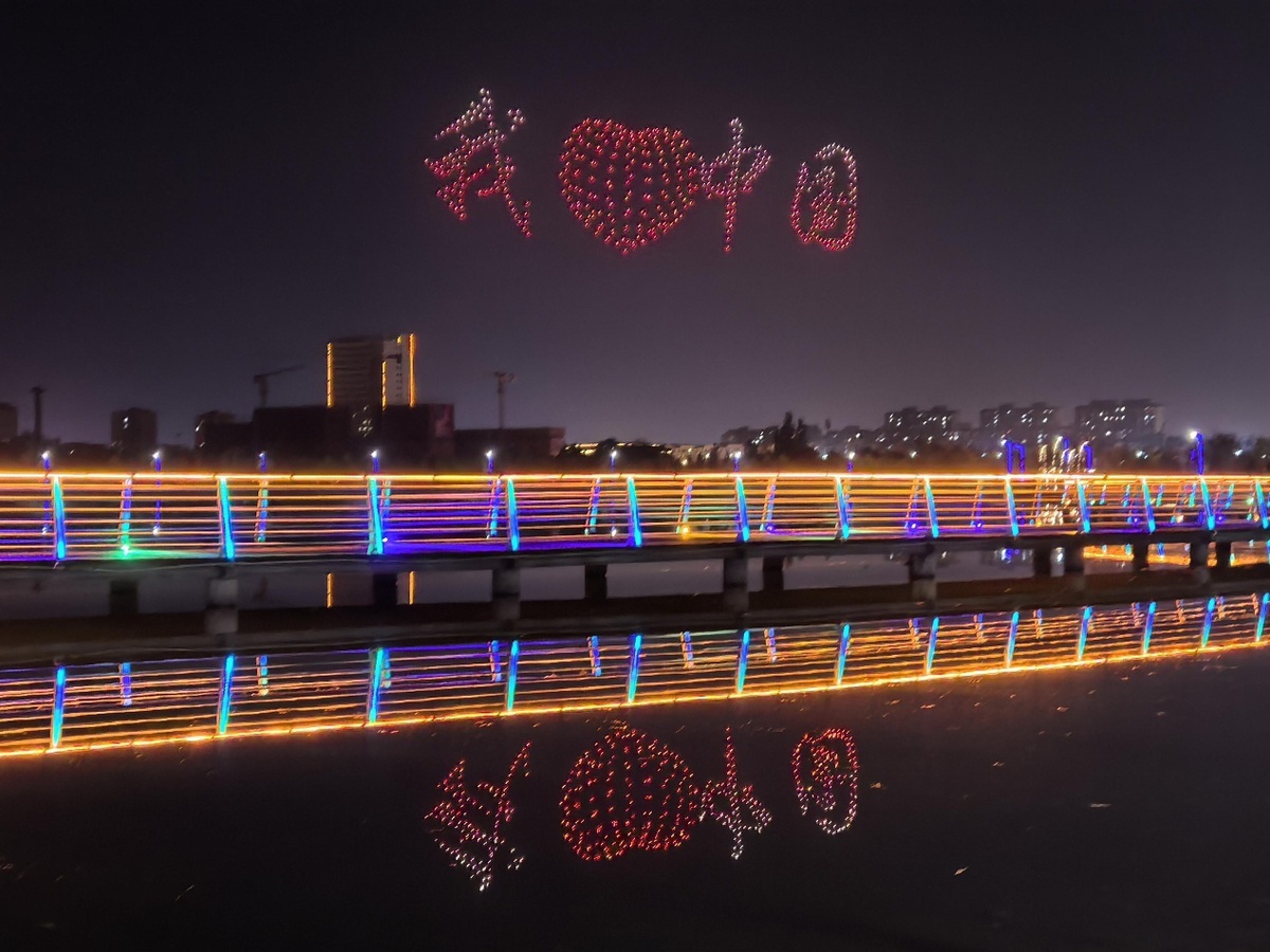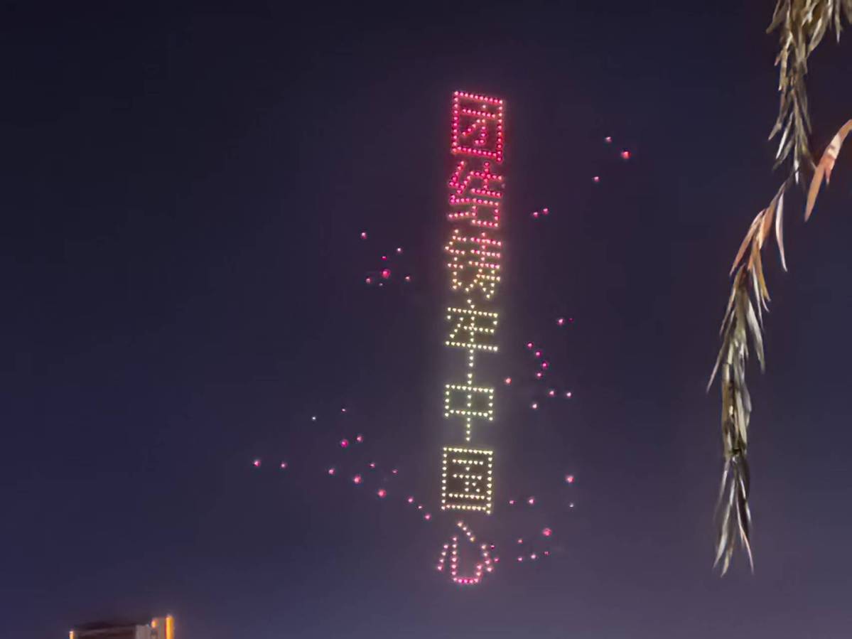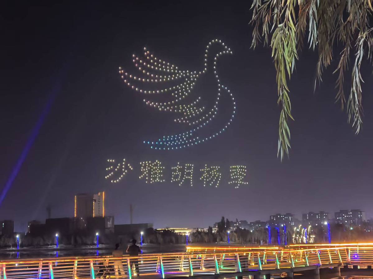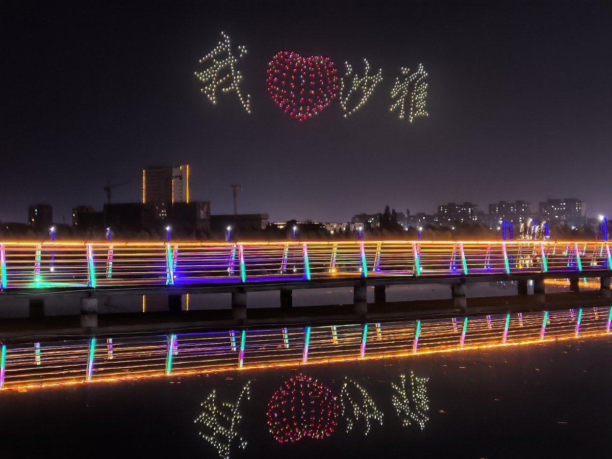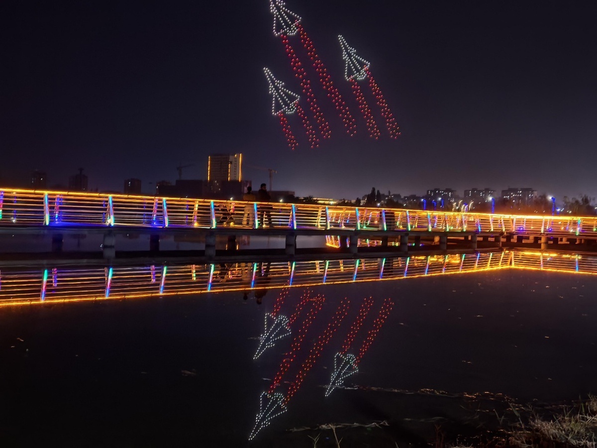 当晚,“星河倾泻,代码成诗”数百架无人机如流星划破夜空,以精准的算法编织出流动的银河。它们时而聚作璀璨星云,时而散成漫天萤火,仿佛将科幻电影中的未来图景搬进了现实。无人机群如被无形指挥棒点亮的音符,在夜空中跳起无声的舞蹈。金属机身折射出冷冽的蓝光,与LED灯带交织成流动的光带,仿佛一场来自赛博朋克世界的视觉盛宴,点亮新疆沙雅县夜空。