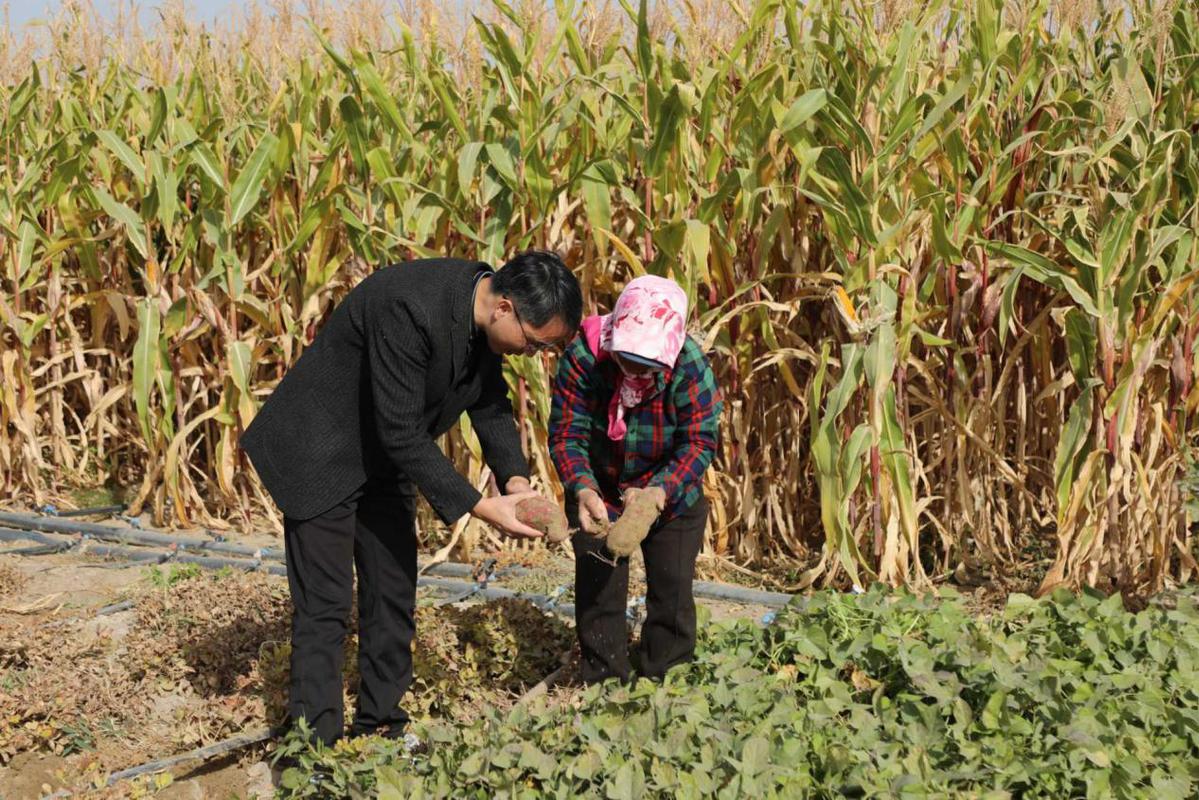 董伟仁(左)和种植户一起在试验田中查看红薯长势。阿迪力·艾尼 摄