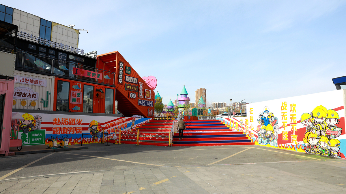 整条主题街区设计巧妙,内容丰富,形成了连贯的参观体验线路。街区入口处的消防宣传壁画区,以色彩明快、形象可爱的消防卡通壁画和醒目标语吸引眼球,中间的“彩虹楼梯”更成为孩子们喜爱的拍照打卡点,在童趣中播撒安全的种子。