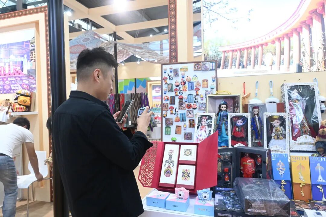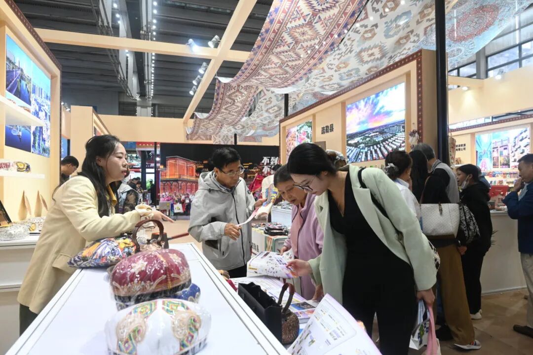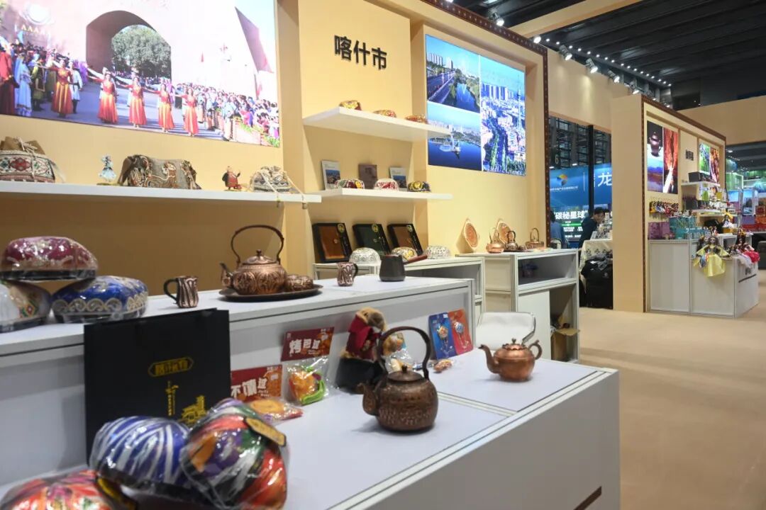 此次喀什地区展团由深圳市对口支援新疆工作前方指挥部提供资源支持、发挥桥梁作用,汇聚喀什12县市文旅主管单位及优秀文旅企业代表奔赴山海、共同参展。展团带来的“喀什好礼”超5000件,展品分为文创、非遗、农副产品三大类。文创区内,以帕米尔高原风光和古城建筑为灵感的冰箱贴、帆布包等产品,深受年轻人的喜爱;非遗区内,英吉沙模戳印花布、喀什市手工铜器摆件前,吸引了众多专业采购商驻足,深入询问合作细节。