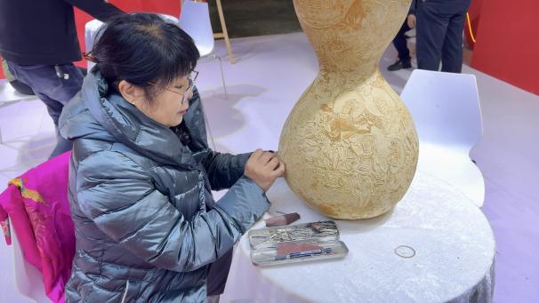 展厅内,浓郁的民族歌舞氛围贯穿始终,新疆各地的文旅特色在展示中愈发鲜明。记者在乌鲁木齐展区看到新疆工艺美术大师、葫芦雕刻乌鲁木齐市级非物质文化遗产传承人马江红正端坐案前,手中的刻刀在葫芦表面缓缓游走,几笔勾勒间,雪地里的驼队、冬日天山的轮廓便逐渐清晰。她面前的展柜上,摆放着十余件已完成的葫芦雕刻作品,既有传统的民族纹样,也有融入冰雪元素的创新设计,不少观众举起手机记录雕刻过程,不时有人轻声询问作品背后的文化故事。