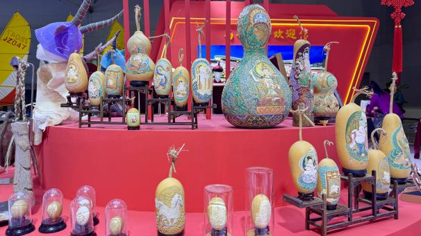 第十九届新疆冬季旅游产业交易博览会乌鲁木齐展区的葫芦雕刻作品。臧嵘摄