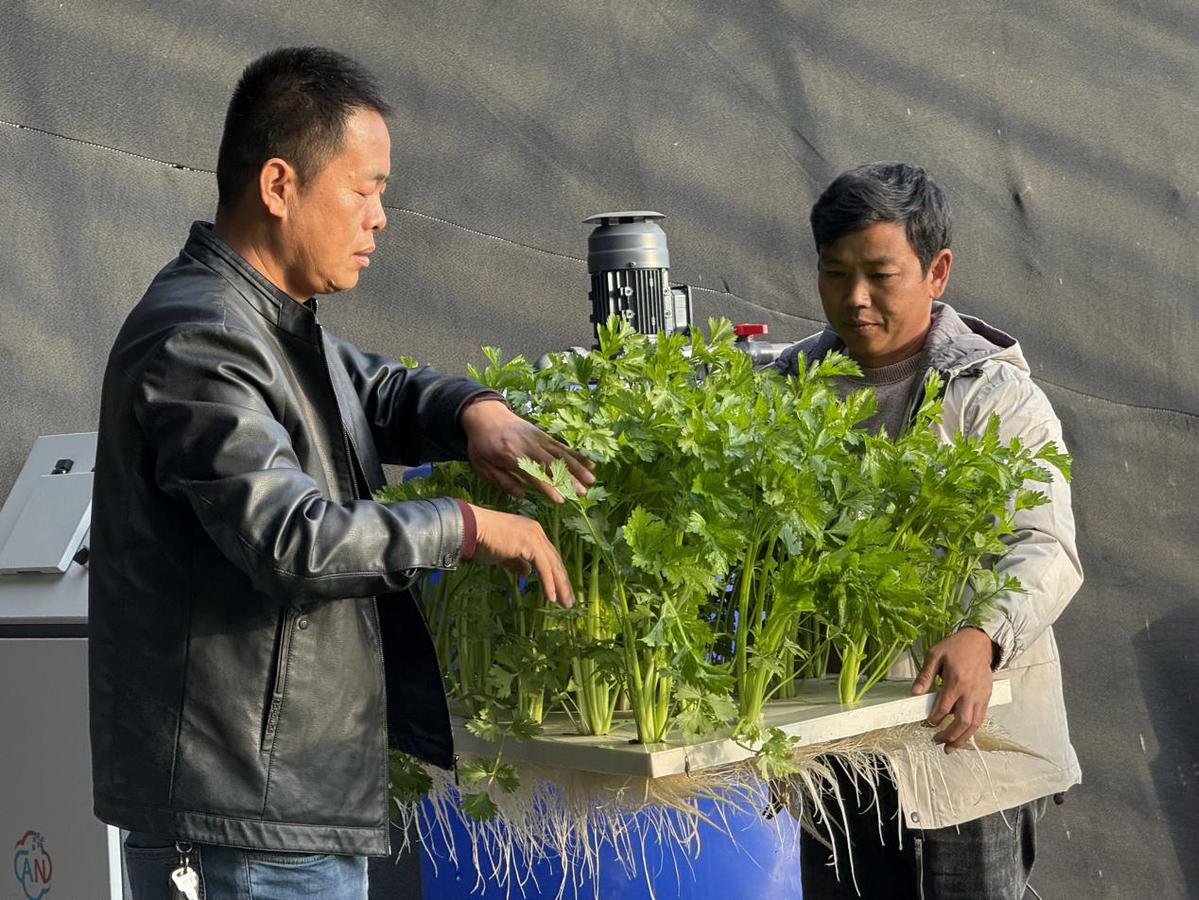 梁升和与陈培勇查看水培芹菜生长状况。朱志升 摄