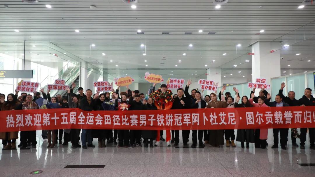 鲜花、掌声、喝彩,当这些滚烫的祝福,涌向载誉归来的阿卜杜艾尼·图尔贡时,新疆喀什的冬风也因这位运动健儿,漾起了最热烈的欢喜。11月24日上午,阿卜杜艾尼结束第十五届全国运动会的征程,乘坐飞机返回家乡喀什,一出现,便被欢呼的人群紧紧包围。这位从喀什走出的铁饼运动员,在本届全运会上以64.40米的成绩摘得男子铁饼项目桂冠,为新疆队拿下一枚宝贵金牌,也让喀什的名字再次闪耀在全国体育赛场。