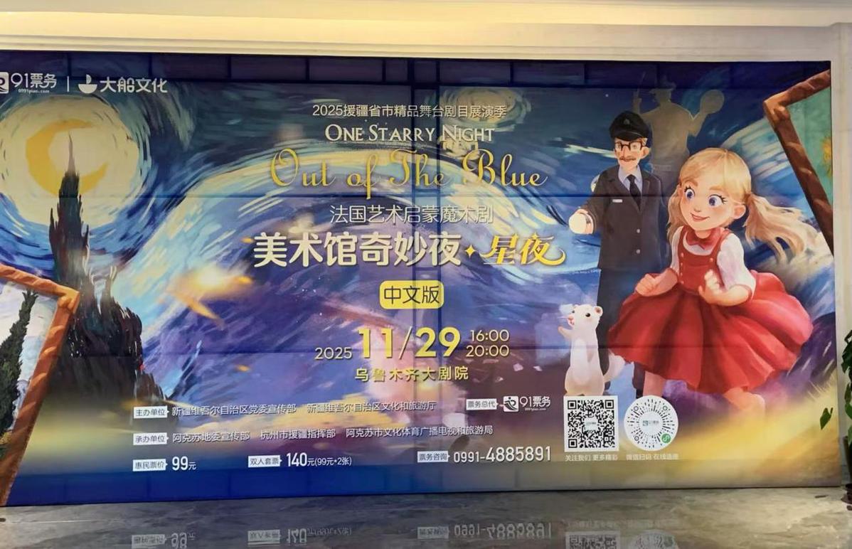 寒冬伊始,欢乐续航。乌鲁木齐市首个雪假首日,浙江省援疆引进的法国艺术启蒙魔术剧《美术馆奇妙夜·星夜》,在乌鲁木齐大剧院精彩上演。这场集名画、名曲与魔术于一体的艺术盛宴,为开启雪假的孩子们送上了一份沉浸式文化大礼,在欢声笑语中播撒艺术种子。