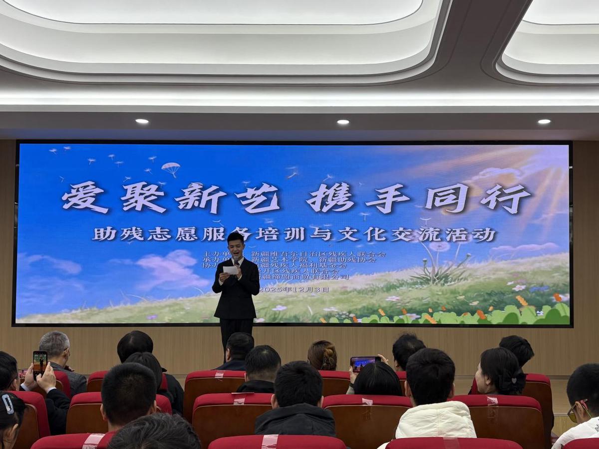 在第34个世界残疾人日来临之际,为弘扬志愿服务精神,推动助残事业深入发展,促进残健融合,在新疆残联指导下,新疆助残协会、携手新疆艺术学院于近日成功举办“爱聚新艺 携手同行”助残志愿服务培训与残障文化交流活动。新疆残疾人福利基金会、经开区残联等相关单位负责人、爱心企业代表、乌鲁木齐盲校师生及新疆艺术学院师生志愿者共同参与了此次活动。