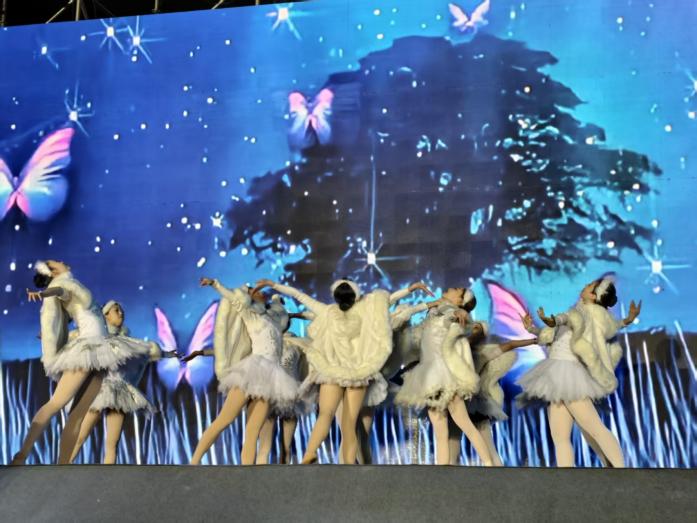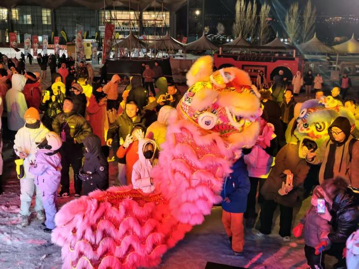 活动当晚,风情舞台文艺展演率先拉开帷幕,多元文化节目轮番登场,勾勒出乌鲁木齐文化共生共融的生动图景。舞狮表演开场即点燃全场氛围;8位艺人奏响的木卡姆旋律,将千年丝路文化底蕴与冰雪场景深度融合;非洲鼓舞以奔放节奏打破地域壁垒,与冰雪的纯净形成独特反差,尽显文化交流活力;舞蹈《飞天》则让敦煌经典形象“现身”冰雪世界,传统美学与现代舞台的碰撞带来强烈视觉冲击;《幸福欢歌》《草原香》等歌曲,更以质朴旋律唱出新疆民众的幸福生活。