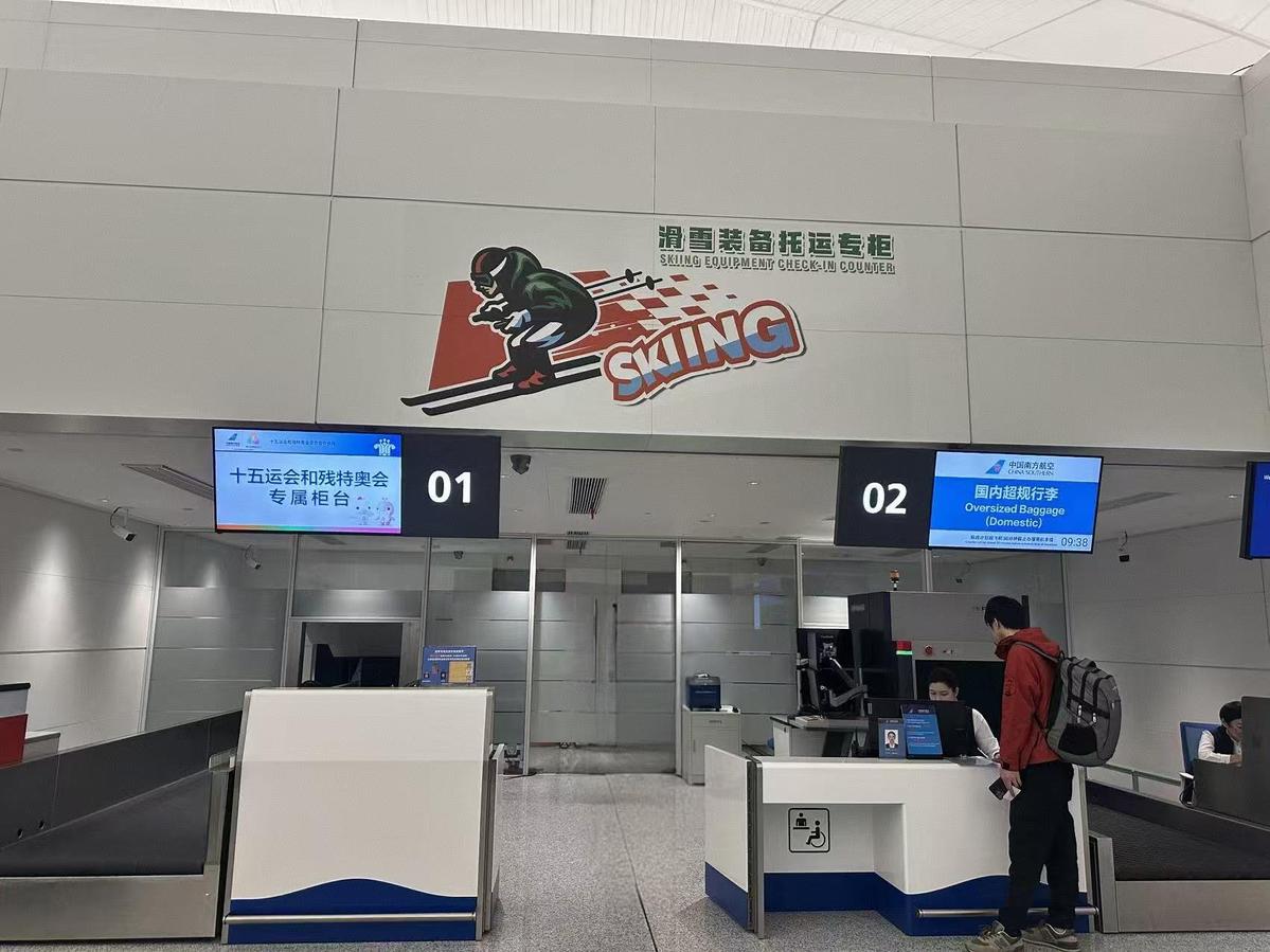 为方便滑雪板、雪杖等大件异形行李的快速托运,机场在出发大厅设置了醒目的“滑雪装备托运专柜”专属区域。该区域配有清晰的中英文引导标识及滑雪者剪影图案,其中专设的“国内超规行李”柜台,可集中为旅客办理滑雪板等特殊尺寸运动装备的托运手续。旅客抵达机场后,可根据现场指引直接前往该区域办理,无需在常规值机柜台排队,实现“快人一步,装备畅行”。