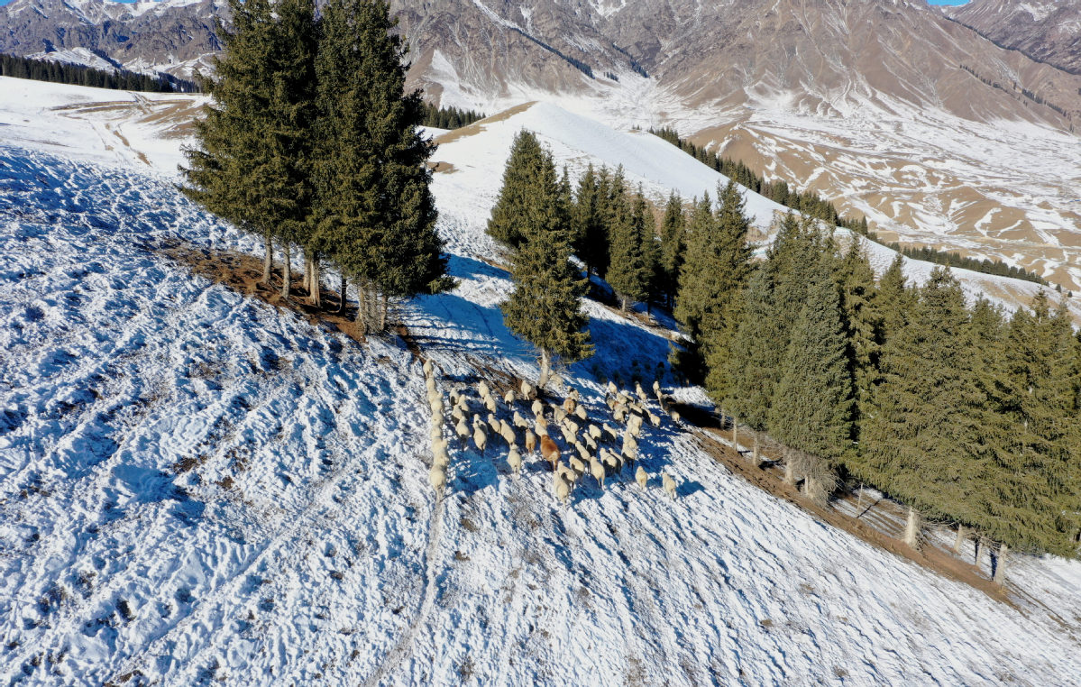 昌吉市南部山区,羊群低头啃食着雪下的枯草,身影在松枝间穿梭,与远山、林海、雪原相映成一幅灵动的冬日牧歌图。(刘华摄)