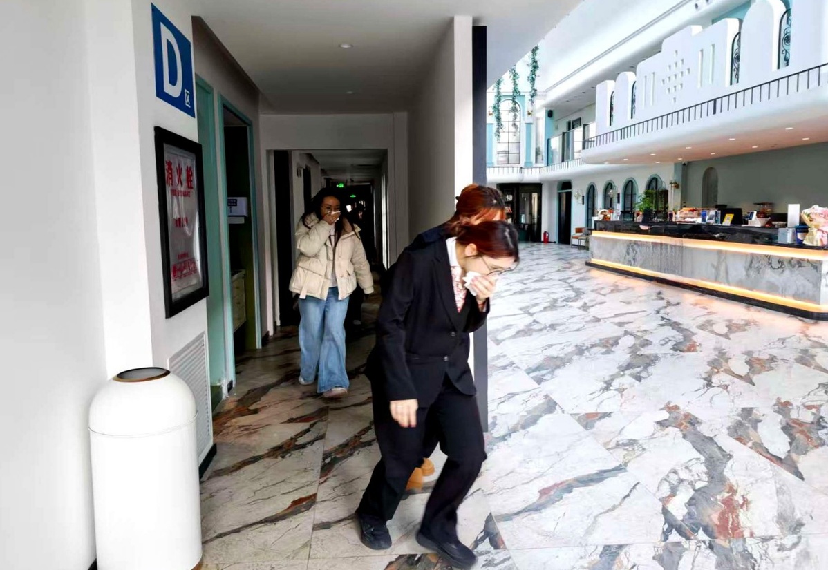 演练模拟酒店客房突发火情,随着警报声响起,现场迅速启动应急预案。酒店工作人员按照预定分工,快速组织人员疏散,引导大家弯腰捂鼻,沿安全通道有序撤离至指定安全区域。消防员则携带专业设备,迅速开展火情侦察、内攻灭火等实战操作。现场各环节衔接紧密、有条不紊,达到了预期效果。