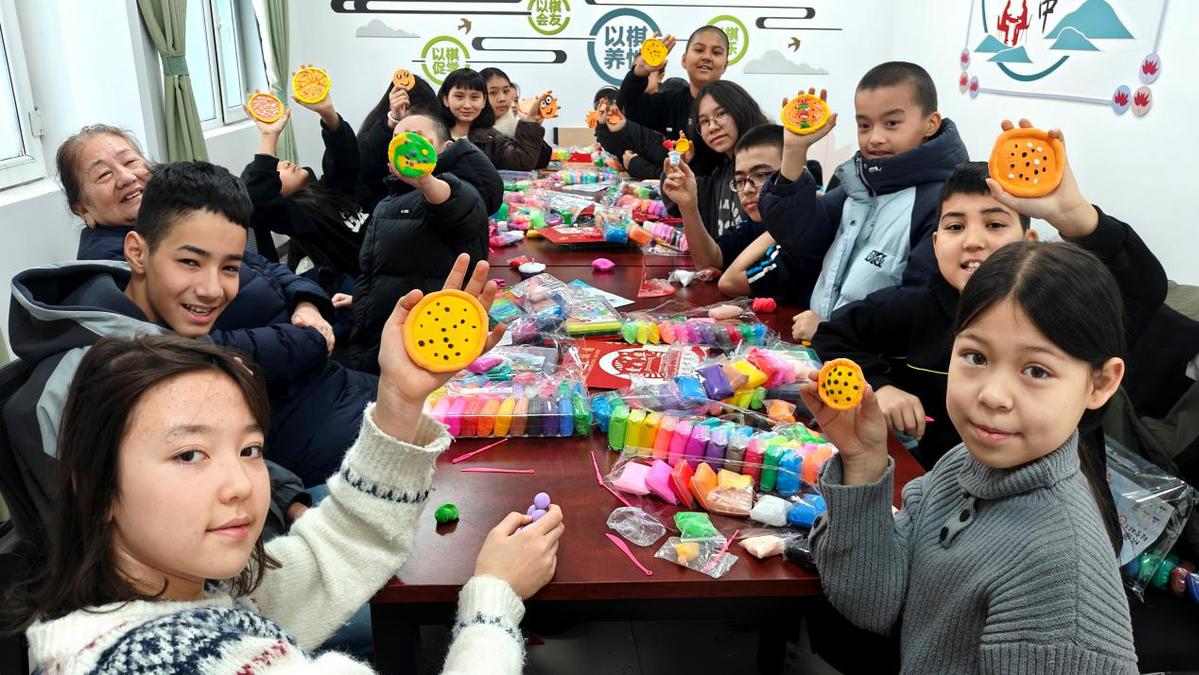 “看,我的‘馕’做好啦!”7岁的小男孩乐乐举起手中彩泥做的馕,骄傲地向妈妈展示。在福星社区的非遗体验活动现场,30多个孩子正忙得不亦乐乎。