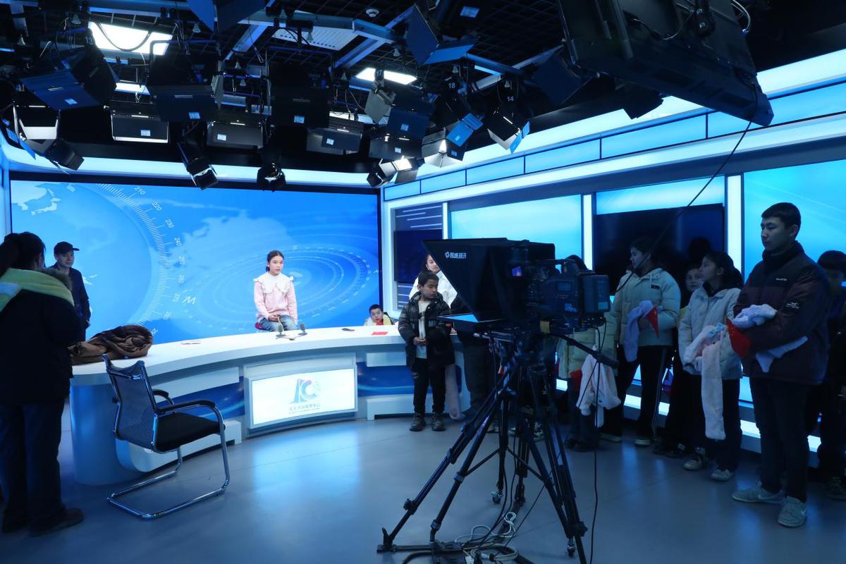 在融媒体中心,孩子们依次参观了演播室、导播间等功能区域,现场观摩VR制作、学习设备操作。在主持人引导下,他们走上演播台,化身“小小主持人”,对着镜头认真播报、体验录音,在紧张又新奇的体验中,真切感受融媒体工作的专业性与趣味性。