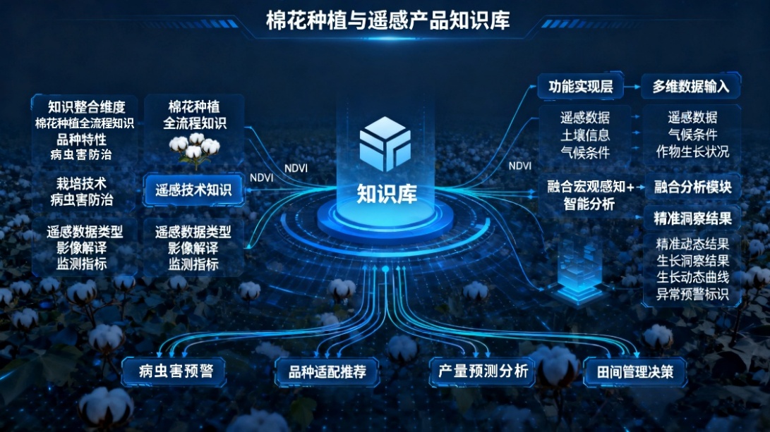 不同于传统农业管理系统,棉花生产大模型以“主动感知、精准监测、智能决策、便捷交互”为核心,实现“动态预警与主动感知”“‘空天地’一体化精准监测”“全周期智能决策与农艺管理”“便捷交互与用户定制模块”四大关键突破。
